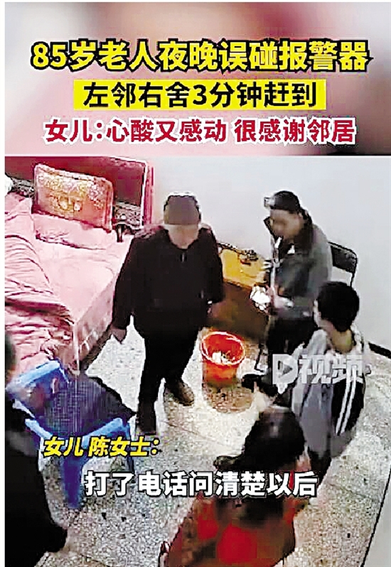 3月25日,湖南邵阳,85岁老人夜晚误碰报警器,左邻右舍3分钟之内赶到查看。女儿陈女士称,母亲愿意一个人生活,当晚母亲误碰到报警器,但报警器在屋外响,母亲听不到,附近的四五家邻居马上进家查看,很感动,感谢邻居们。