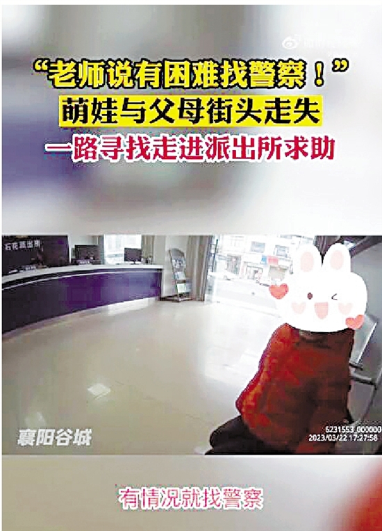 近日,湖北谷城石花镇,一位4岁女童在与父母一起逛商场途中不慎走失,小女孩因为害怕不敢随意求助,但她想起幼儿园老师讲过“有困难就求助警察叔叔!”而且自己大概记得派出所的位置,便自己独自一人走出商场,沿着马路一边走一边寻找,最终在一位热心女士的指引下,成功来到派出所。派出所民警一边安抚小女孩,一边在周围打听是否有人认识小女孩。最终,民警联系到了小女孩的舅舅将其接走。