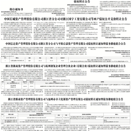 根据国家法律及财政部、银监会的有关规定,以及浙江省浙商资产管理股份有限公司与杭州创瓴企业管理合伙企业(有限合伙)签署的《债权转让协议》(合同编号:BC11812911B3282),浙江省浙商资产管理股份有限公司已将其对下列借款人及其担保人项下享有的全部权利(包括但不限于主债权、担保债权、违约金债权、利息债权、损失赔偿权)依法转让给杭州创瓴企业管理合伙企业(有限合伙)。浙江省浙商资产管理股份有限公司与杭州创瓴企业管理合伙企业(有限合伙)联合公告通知各借款人及担保人以及其他相关各方。