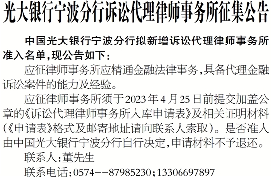 光大银行宁波分行诉讼代理律师事务所征集公告