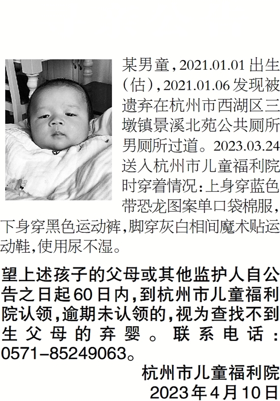 望上述孩子的父母或其他监护人自公告之日起60日内,到杭州市儿童福利院认领,逾期未认领的,视为查找不到生父母的弃婴。联系电话:0571-85249063。