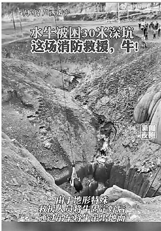 近日,在广西南宁,一头重约700斤的水牛掉入深坑,无法脱困。消防救援人员接警后,立即赶赴现场处置。由于地形特殊,救援人员用吊车将水牛吊出地面。消防员:不是吹牛,这头牛飞了!