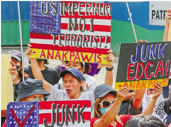| 菲律宾民众抗议菲美联合军演 4月11日,在菲律宾首都大马尼拉地区奎松城,民众参加集会活动,抗议菲律宾和美国军方举行联合军事演习。 菲律宾和美国军方4月11日在菲首都马尼拉启动为期18天的2023年度“肩并肩”联合军事演习。不少菲律宾民众举行集会抗议军演,一些学者认为军演可能对地区安全和稳定构成风险。 新华社发 乌马利 摄 |