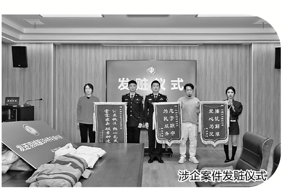 4月12日,平湖市政法一体化涉企案件快办中心举行发赃仪式,警方通过涉企案件一体化快办机制,向3家企业提前发还价值45余万元的涉案财物。