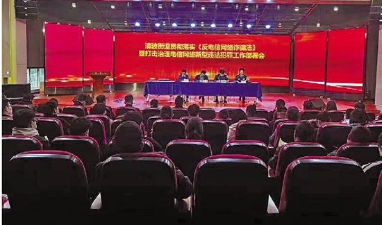 本报讯 近日,杭州市上城区清波街道、清波派出所、清波司法所共同召开打击治理电信网络新型违法犯罪会议,进一步加强防范电信网络诈骗宣传力度,坚决遏制诈骗案件高发态势,营造浓厚的全民反诈氛围。柳翠井巷社区、清波门社区和中大吴庄物业在会上作经验交流。