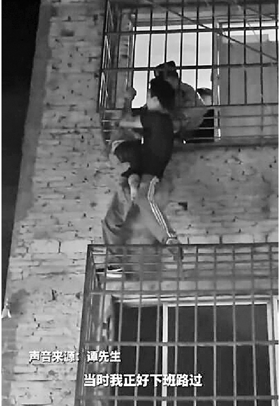 近日,贵州遵义,一男童头部被防盗窗卡住,身体悬空在三楼外。危急时刻,下班路过的谭先生借助三轮车和梯子爬上二楼防盗窗托举男童,直到民警成功将孩子救下。网友:为挺身而出的平凡英雄点赞!