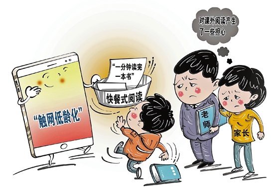 | 担 心 4月23日是第28个世界读书日。记者在多地采访发现,近几年特别是“双减”后,中小学开展各类阅读活动的时间更多、形式更加丰富。但随着“触网低龄化”,部分老师、家长也对课外阅读产生了一些担心。 现在网络上尤其是短视频平台上,有很多小短文或“一分钟读完一本书”之类的内容,如果习惯了这种快餐式阅读,可能会消解孩子们沉浸式阅读、深阅读的兴趣和专注力。 新华社 商海春 |