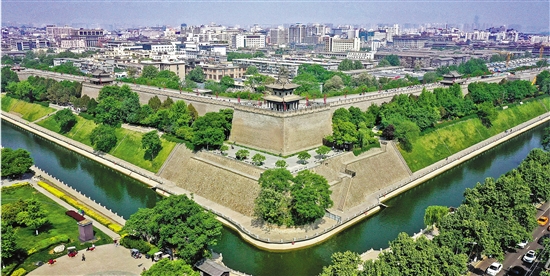 西安明城墙东南城角(4月19日摄,无人机照片)。春和景明,万物昭苏,西安明城墙被郁郁葱葱的绿植及绚丽多彩的春花装点一新,成为市民及游客踏春赏景的好去处。 新华社 刘潇