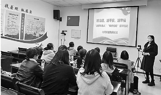 法律明白人向社区居民宣讲“枫桥经验”创新社会治理成果,人民调解工作在化解矛盾纠纷中的优秀做法,以及目前社区“共享法庭”的运行情况等;倡导广大居民自觉尊法学法守法用法,做到“小事不出社区,大事不出街道,矛盾不上交”。