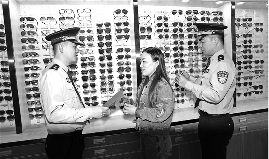 连日来,临海市公安局杜桥派出所组织民警开展盗版商品检查工作,向经营者讲解知识产权相关法律法规,引导经营者合法经营。图为民警在某眼镜厂样品室向负责人宣讲知识产权方面知识。