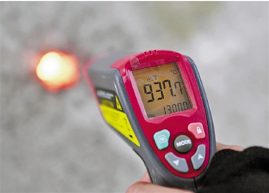 为了测试不同施工距离对火灾发生几率的影响,工作人员将施工高度降低至1米进行同样的操作。这一次,一阵火光四射,下方的棉被多处位置同时被引燃,火势蔓延速度较前一次要快得多。“很明显,距离越近,火灾越容易发生。”消防员拿过一旁的红外测温仪对地上的熔渣进行测温,结果显示高达937℃。