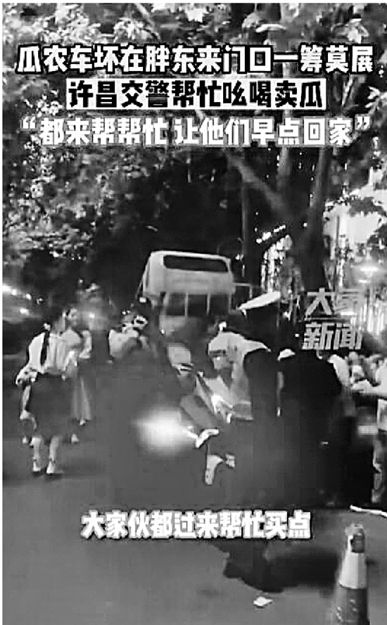 近日,河南许昌,一瓜农因车坏在了商业区门前路口一筹莫展。交警赶到现场后,为保障交通安全,便用警车喇叭帮忙吆喝卖瓜,“这天也黑了,一会修理厂也关门了,大家伙都过来帮忙买点,让他们一会安安心心去修车,早点回家。”其他交警也围在车旁帮瓜农装袋卖瓜。