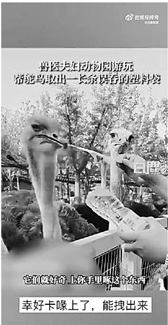 近日,在山东诸城,李女士一家去动物园游玩,发现鸵鸟误吞异物,当机立断从其口中拽出一长条装着食物的塑料袋。李女士说,本来想叫管理员过来,但当时情况紧急,如果鸵鸟将异物吃进胃里会危及生命。自己和丈夫都是兽医师,经常帮动物做异物取出,于是一边安抚这只鸵鸟,一边引开旁边“捣乱”的鸵鸟同伴,最终顺利将塑料袋全部拽出来。