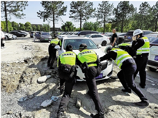 ④“你好!能请你们帮个忙吗?”5月1日下午,在桐乡一处临时停车场,一辆汽车陷入土坑,驾驶员无奈求助。桐乡濮院交警中队的铁骑队员们紧急出动,找来石板垫在车轮处,成功将车子开了出来。