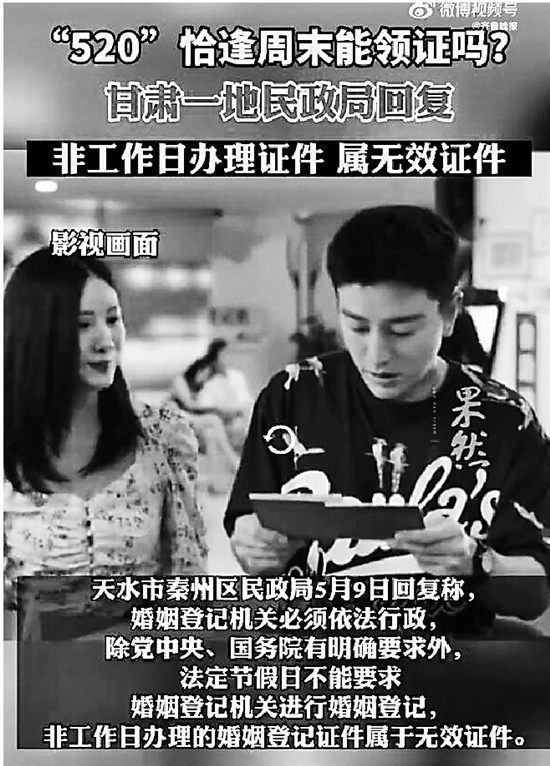针对网民希望民政局5月20日和21日周末两天可以上班办结婚证的留言,甘肃省天水市秦州区民政局回复称,婚姻登记机关必须依法行政,非工作日办理的婚姻登记证件属于无效证件,引发关注。秦州区婚姻登记服务中心一工作人员回应已知晓此事,目前没有接到非工作日加班的通知。另一工作人员表示非工作日不能办理业务,是婚姻登记的规定,即使办了也是无效证件。如有需求,可向相关部门反映此事。