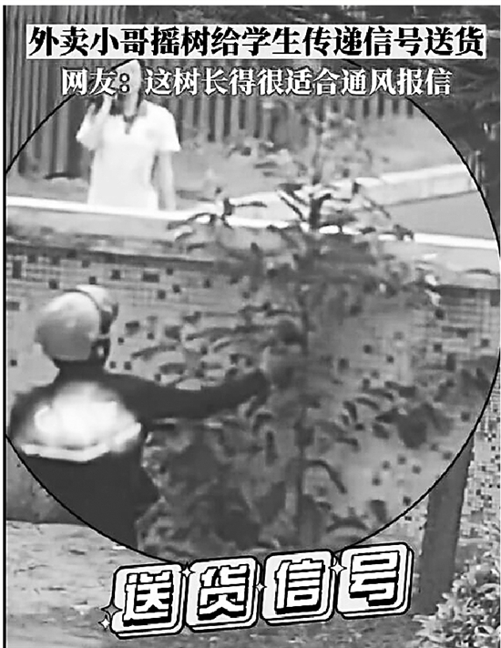 外卖员墙外摇小树给学生报告位置