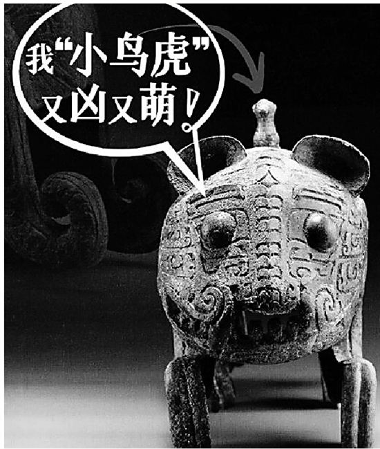 江西新干县出土的商伏鸟双尾青铜虎,是存世最大的先秦青铜虎。这只有两条尾巴的青铜虎,侧面看双目圆凸、獠牙尖长,尽显猛虎之威;正面拓片纹样好似虎头帽,萌态十足。虎背上的一只小鸟气定神闲,与猛虎形成强烈对比。