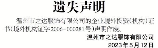 温州市之达服饰有限公司的企业境外投资(机构)证书(境外机构证字2006-000281号)声明作废。