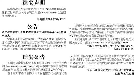 鉴于东阳市添瑜装饰设计工程有限公司的法定代表人、股东、实际控制人、管理人员未能上缴公司的公章、财务章、合同专用章、法人名章等印章,现公告如下:东阳市添瑜装饰设计工程有限公司的全部印章自2022年6月22日起停止使用。