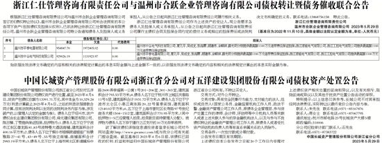 根据浙江仁仕管理咨询有限责任公司与温州市合跃企业管理咨询有限公司签订的《债权转让协议》,温州市合跃企业管理咨询有限公司所合法拥有的本公告项下资产(包括债权及担保从权利),已依法转让给浙江仁仕管理咨询有限责任公司,温州市合跃企业管理咨询有限公司特公告通知债务人及担保人或义务承担人,从公告之日起向浙江仁仕管理咨询有限责任公司履行相关义务。