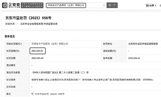 企查查APP显示,近日,苹果电子产品商贸(北京)有限公司因发布虚假广告被北京市东城区市场监督管理局行政处罚20万元。处罚详情显示,当事人所售的MacbookAir笔记本发布的商业广告称“M1芯片拥有我们迄今打造的最快的中央处理器”等内容,经调查,苹果公司已于2021年10月推出了配备M1Pro和M1Max芯片的MacBookPro,运行速度相比M1提升最高可达70%。综上,案发时M1芯片配备的中央处理器并非为苹果公司打造的最快的,存在内容与事实不符。
