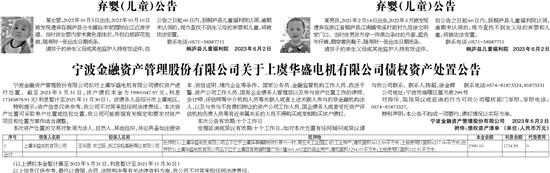 宁波金融资产管理股份有限公司关于上虞华盛电机有限公司债权资产处置公告