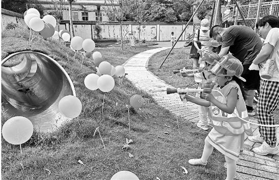 5月31日,金华市南苑幼儿园举行以“安全‘童’行”为主题的亲子游园活动,将小小交警、消防救火、远离溺水等9项安全教育内容融入丰富多彩的游园活动中,让孩子们在游戏中提高安全自护意识。