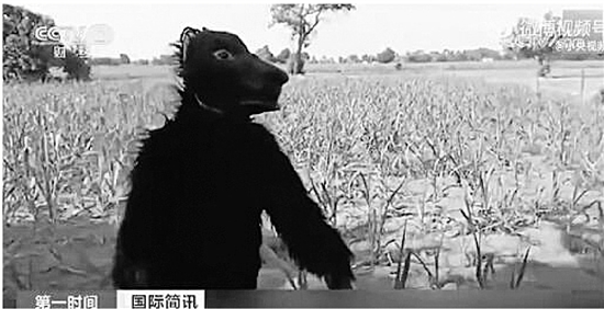 为保护庄稼免受猴子等动物的毁坏,印度北方邦的一些村庄正雇人扮演黑熊。画面中,一名男子伪装成熊,在湿热的田地里来回走动,吓唬猴子。当地村民称,他们以每天250卢比(约21元人民币)的价格雇了男子9小时,这种方法在白天效果不错。