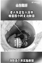 近日,山东临沂,一老人失足坠入5米深井,因地处偏僻,被困4小时才被人发现帮忙报警。消防员赶赴现场,小心下入井中,为老人做好防护后,由队友配合帮其脱困。提示:外出时,千万要注意脚下安全。
