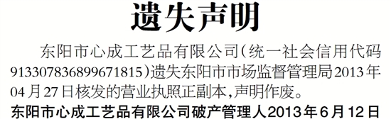 东阳市心成工艺品有限公司(统一社会信用代码913307836899671815)遗失东阳市市场监督管理局2013年04月27日核发的营业执照正副本,声明作废。