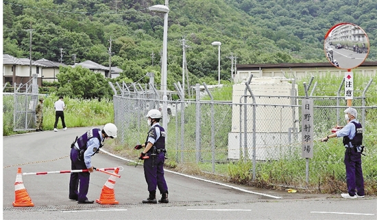 6月14日,在日本岐阜县岐阜市,警方人员在发生枪击事件的陆上自卫队射击训练场附近警戒。
