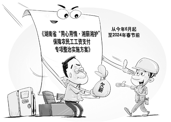 | 助力讨薪 记者近日从湖南省人社厅获悉,湖南省保障农民工工资支付工作领导小组办公室已正式印发《湖南省“用心用情·湘薪湘护”保障农民工工资支付专项整治实施方案》,确定从今年6月起至2024年春节前,在全省组织开展保障农民工工资支付情况专项整治,持续巩固拓展根治欠薪成果。 新华社 王鹏 |