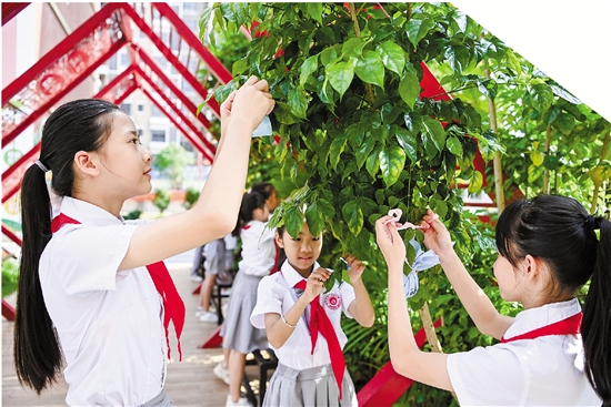 6月20日,在广西玉林市兴业县第一实验小学,学生们将制作好的香囊挂在树上。