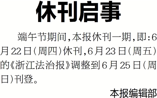 端午节期间,本报休刊一期,即:6月22日(周四)休刊,6月23日(周五)的《浙江法治报》调整到6月25日(周日)刊登。