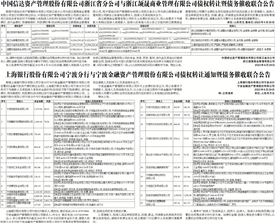 上海银行股份有限公司宁波分行与宁波金融资产管理股份有限公司债权转让通知暨债务催收联合公告