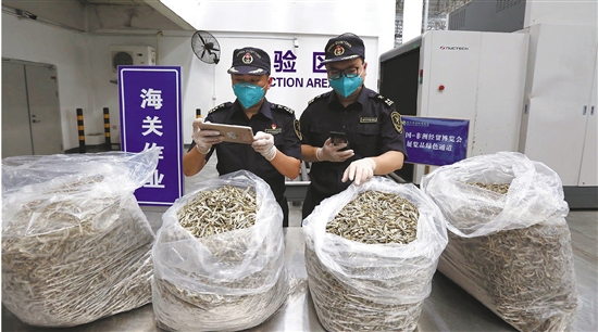 | 6月26日,长沙海关关员对进口鳀鱼干实施查验。 产自肯尼亚的27件、315公斤野生鳀鱼干6月26日运抵长沙黄花国际机场,长沙黄花机场海关按规定实施检验检疫,为这批鳀鱼干出具了入境货物检验检疫证明并办理通关放行手续。这是中国首次进口肯尼亚野生鳀鱼产品。 新华社 |