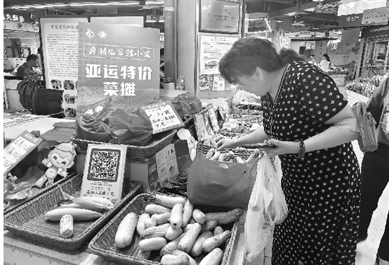 “这个摊子上的蔬菜都很新鲜,而且价格真的很便宜,还可以顺便了解亚运知识嘞……”一名前来买菜的大妈一边挑着蔬菜,一边说道。
