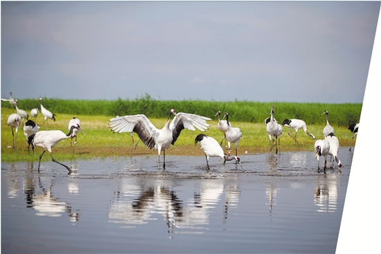夏日,位于黑龙江省西部的黑龙江扎龙国家级自然保护区郁郁葱葱,丹顶鹤悠闲觅食,自在飞翔,呈现出一派生机勃勃的生态美景。