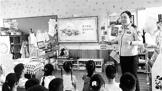 暑假来临,台州市公安局椒江区分局府前派出所女警顾乐走进辖区幼儿园,为孩子们讲解防溺水、防交通事故、防火等安全防范知识,受到了孩子们的欢迎和好评。