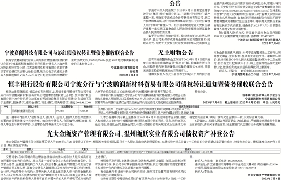 恒丰银行股份有限公司宁波分行与宁波鹏润新材料贸易有限公司联合公告通知各借款人及担保人以及其他相关各方,从公告之日起立即向宁波鹏润新材料贸易有限公司履行主债权合同及担保合同约定的偿付义务或相应的担保责任。