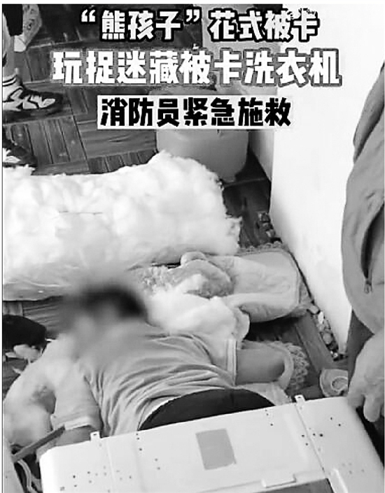 近日,湖北武汉,熊孩子玩捉迷藏时,为了躲得严实点直接钻进洗衣机,结果被卡住出不来了。消防员赶到后,小心拆卸洗衣机帮娃脱困。