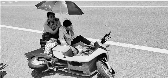 7月3日,天气炎热,龙泉市东大桥上发生交通事故,一名骑电动车女子倒地无法动弹。市公安局交警大队车管所辅警吕少芬刚好路过,她迅速下车查看状况,为事故伤者撑伞并帮助送医,这一幕被路过群众拍下。 通讯员 程文泉 本报记者 陈毅人