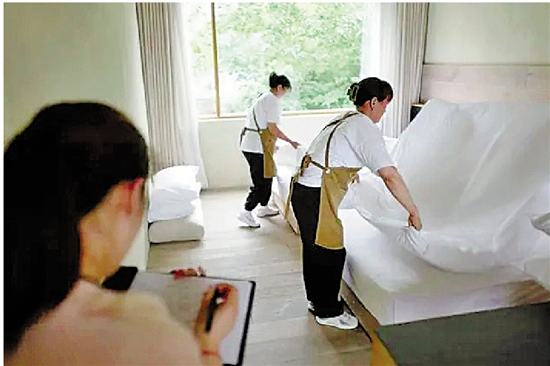 | 学员在莫干山民宿管家培训中心内进行房务考核。 新华社 徐中哲 摄 |