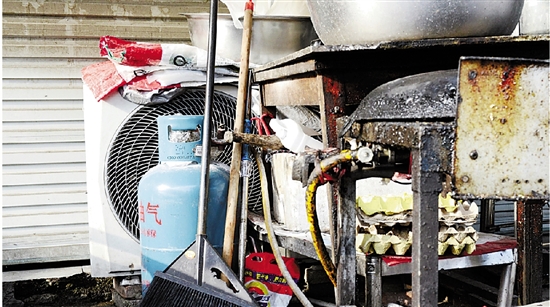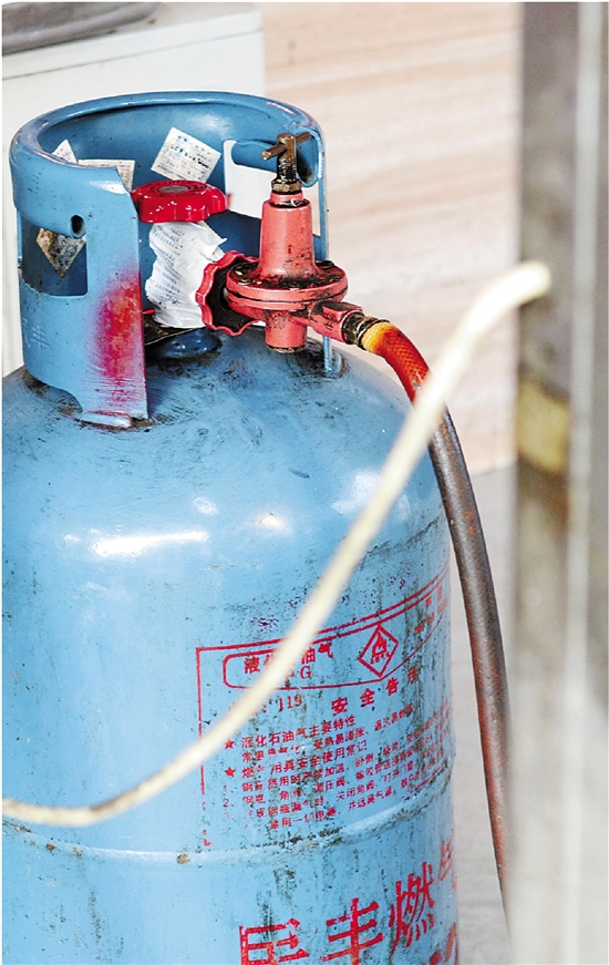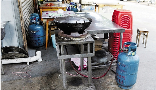 不远处一家没有店名的小餐馆,门口露天摆放着五个液化气瓶,每个都连接着不同灶具,橡胶软管上同样积满了油渍。检查人员严肃要求店家及时更换软管。
