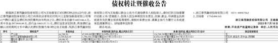 根据浙江泰茂融资担保有限公司与王晓春签订的《债权转让协议》约定,浙江泰茂融资担保有限公司已将其依法享有的对杭州三亚服饰制造有限公司等4户债权(截至各债权所涉民事判决书判决之日,债权资本总额为4857046.6元,其中本金2973908.89元,违约金1883137.71元,债权信息详见附表,具体债权金额以法院裁判文书中确认的债权数额为准)转让给王晓春,现浙江泰茂融资担保有限公司与王晓春以联合公告方式通知债务人和担保人,请你们向王晓春履行还款义务(若借款人、担保人因各种原因发生更名、改制、歇业、吊销营业执照或者丧失民事主体资格等情形,请相关承债主体、清算主体代为履行义务或者承担清算责任)。详细清单见附表