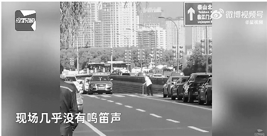 7月19日,吉林省吉林市。早高峰时段,一男子疑腿脚不便,拄着拐杖在斑马线缓慢移动。身后车辆排起长队安静等待,对向车道也停着等他。据目击者称,这位男子过马路大概用了6分钟时间,现场几乎没有鸣笛声。