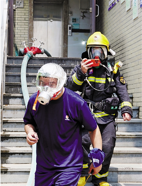 实验开始前,现场记者按抽签顺序选择楼层,为保证安全,每位记者都安排了一名全副武装的消防员贴身保护,并记录记者的逃生过程。