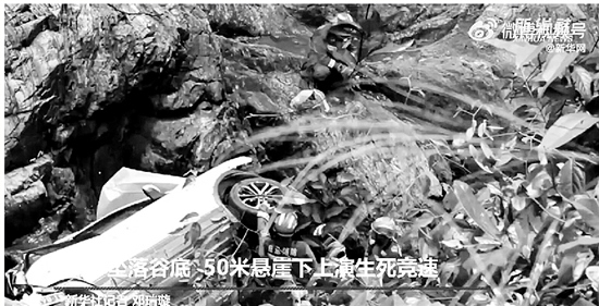 接警后,当地消防部门立即赶赴现场实施救援,公安、医疗、民间救援队等救援力量也到场一同参与营救。事故现场在一处盘山公路旁的悬崖,悬崖底部距离路面约50米深,小轿车从盘山公路冲出路面跌落至崖底。