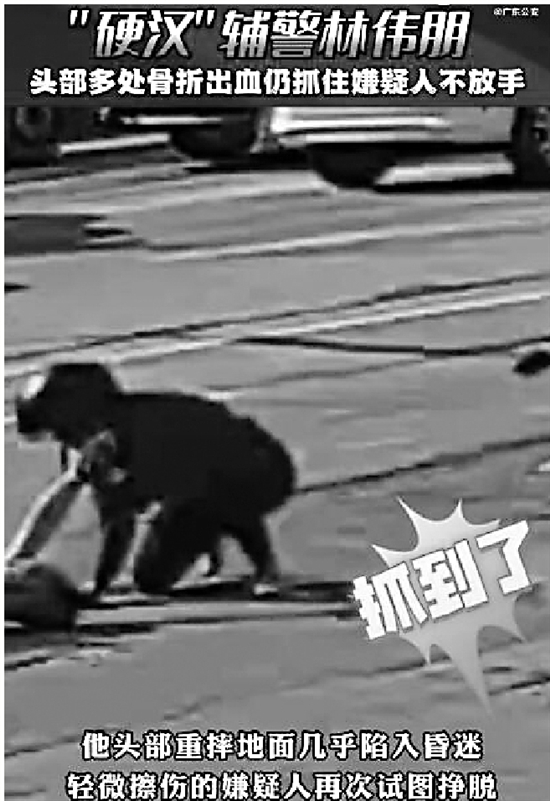 近日,广东江门警方实施抓捕时,一名嫌疑人试图逃离现场。辅警林伟朋一个飞扑,将其抱住,尽管头部重摔在地,但他依然紧抓嫌疑人衣领,直到看见同事将人完全控制才松手。经检查,林伟朋颅骨后部7处骨折并伴有脑出血,经抢救暂时脱离生命危险。
