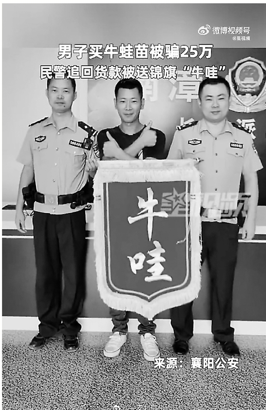 近日,湖北襄阳。一男子购买牛蛙苗被骗25万元,报警后,民警为其追回货款。为表示感谢,男子给民警送上一面印有“牛哇”大字的锦旗,点赞民警办案“很牛”。网友:你是懂谐音的。